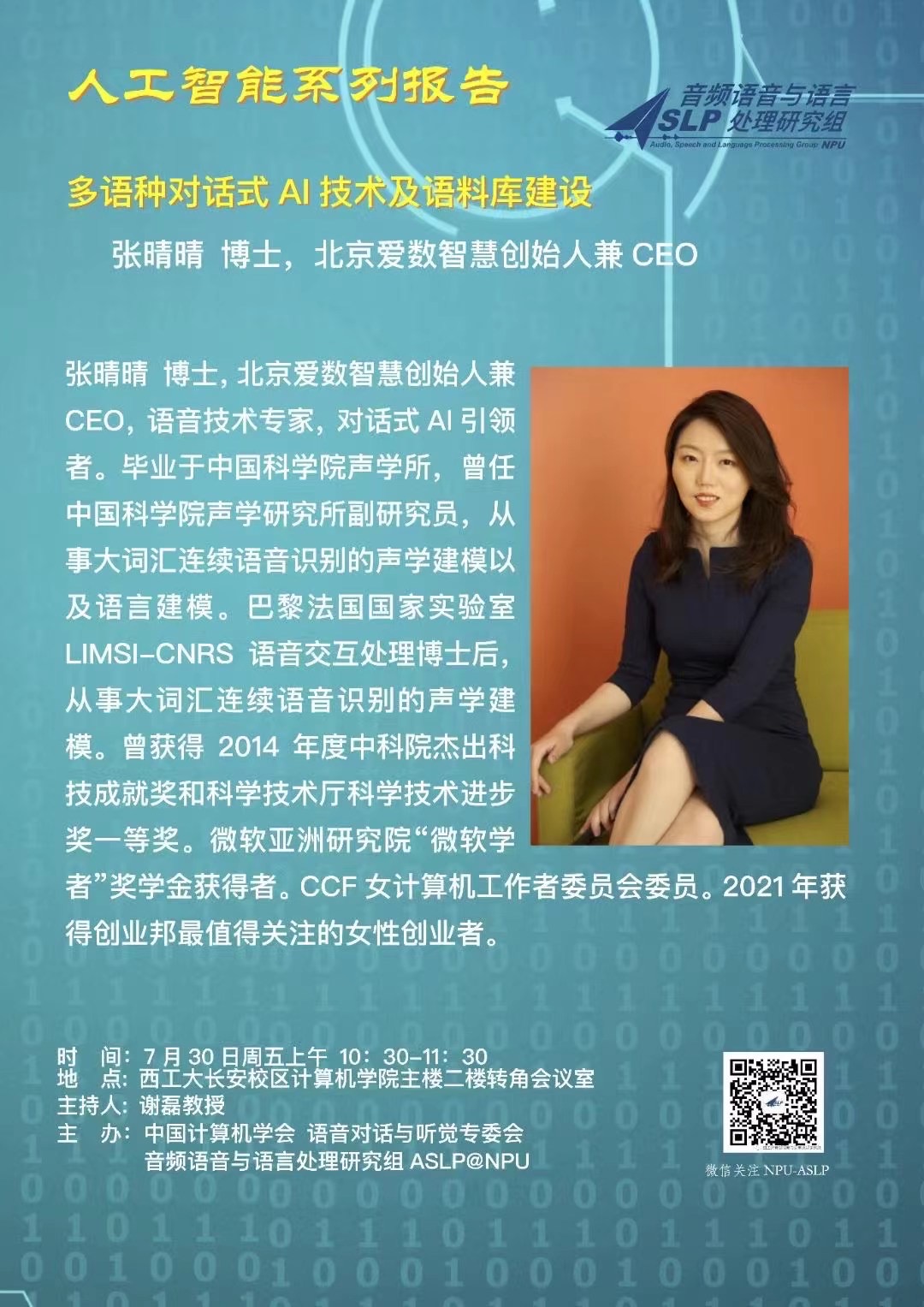 近期,由中國(guó)計(jì)算機(jī)學(xué)會(huì)(CCF)、CCF語(yǔ)音對(duì)話與聽覺專委會(huì)、音頻語(yǔ)音與語(yǔ)言處理研究組聯(lián)合主辦的“人工智能系列報(bào)告”在西北工業(yè)大學(xué)計(jì)算機(jī)學(xué)院舉辦。北京Magic Data創(chuàng)始人兼 CEO張晴晴博士受邀做《多語(yǔ)種對(duì)話式AI技術(shù)及語(yǔ)料庫(kù)建設(shè)》的主題報(bào)告。