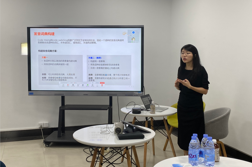 西北工業(yè)大學(xué)計(jì)算機(jī)學(xué)院謝磊教授擔(dān)任本次講座主持,張晴晴與現(xiàn)場(chǎng)聽眾分享對(duì)話式AI技術(shù),多語(yǔ)言識(shí)別系統(tǒng)可實(shí)用化的關(guān)鍵在于,如何解決非母語(yǔ)發(fā)音的插入語(yǔ)識(shí)別問(wèn)題。通過(guò)混合發(fā)音字典建模和混合雙語(yǔ)聲學(xué)建模角度,提高雙語(yǔ)識(shí)別的性能。